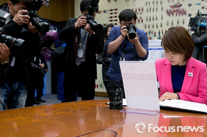 (서울=포커스뉴스) 19일 오후 서울 여의도 국회 본청에 마련된 20대 국회 개원종합지원실에서 전현희 더불어민주당 강남을 당선인이 의원 등록에 앞서 방명록을 작성하고 있다.