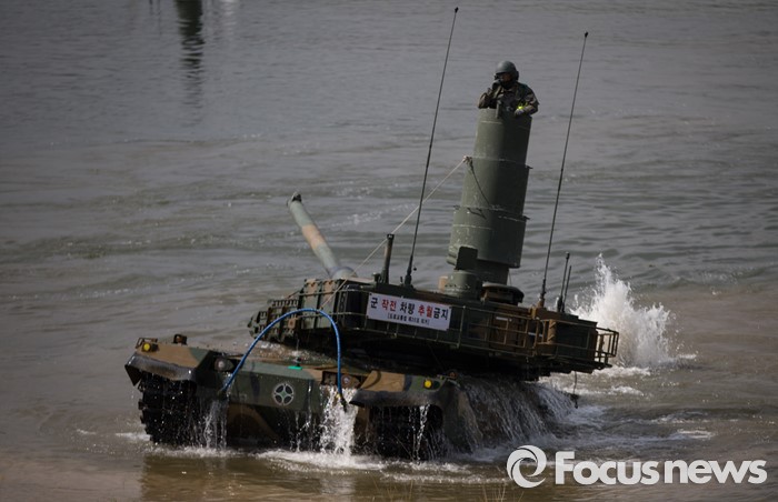 (여주=포커스뉴스) 19일 오전 경기도 여주시 남한강 일대에서 육군 20사단이 K-2 흑표전차 잠수도하훈련을 하고 있다. K-2흑표전차는 최고 4.1m수심의 하천을 문교나 부교없이 독자적으로 건널 수 있다.