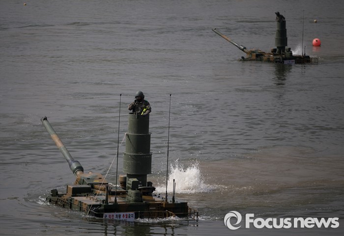 (여주=포커스뉴스) 19일 오전 경기도 여주시 남한강 일대에서 육군 20사단이 K-2 흑표전차 잠수도하훈련을 하고 있다. K-2흑표전차는 최고 4.1m수심의 하천을 문교나 부교없이 독자적으로 건널 수 있다.