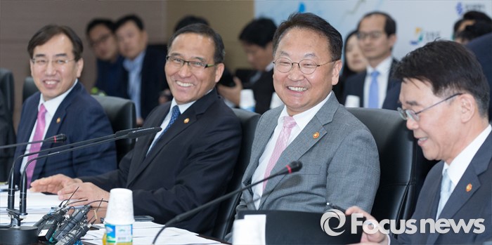 (세종=포커스뉴스) 유일호 경제부총리 겸 기획재정부장관이 19일 오후 세종시 정부세종청사 기획재정부 대회의실에서 열린 2016년 시도지사협의회에 참석해 회의에 앞서 담소를 나누고 있다.