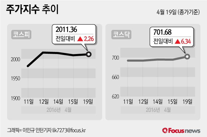 (서울=포커스뉴스) 19일 코스피지수는 전날 보다 0.11%(2.26포인트) 오른 2011.36에 장을 마쳤다. 코스닥지수는 전일 대비 0.91%(6.34포인트) 오른 701.68에 마감했다.