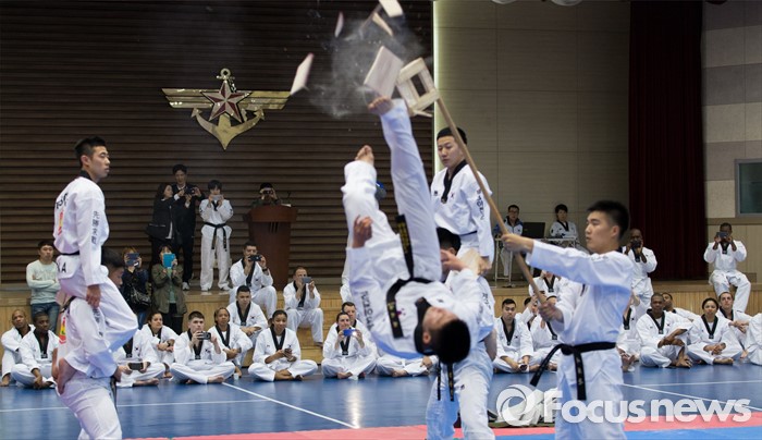 (서울=포커스뉴스) 19일 오후 서울 용산구 국방부 다목적홀에서 한국문화 체험행사에 참가한 주한미군 장병들이 국방부 태권도 시범단의 시범을 보고 있다.