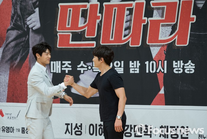 (서울=포커스뉴스) 19일 오후 서울 SBS 목동사옥에서 열린 SBS 드라마 스페셜 '딴따라' 제작발표회에 참석한 배우 강민혁(왼쪽)과 지성이 포토타임을 갖고 있다.