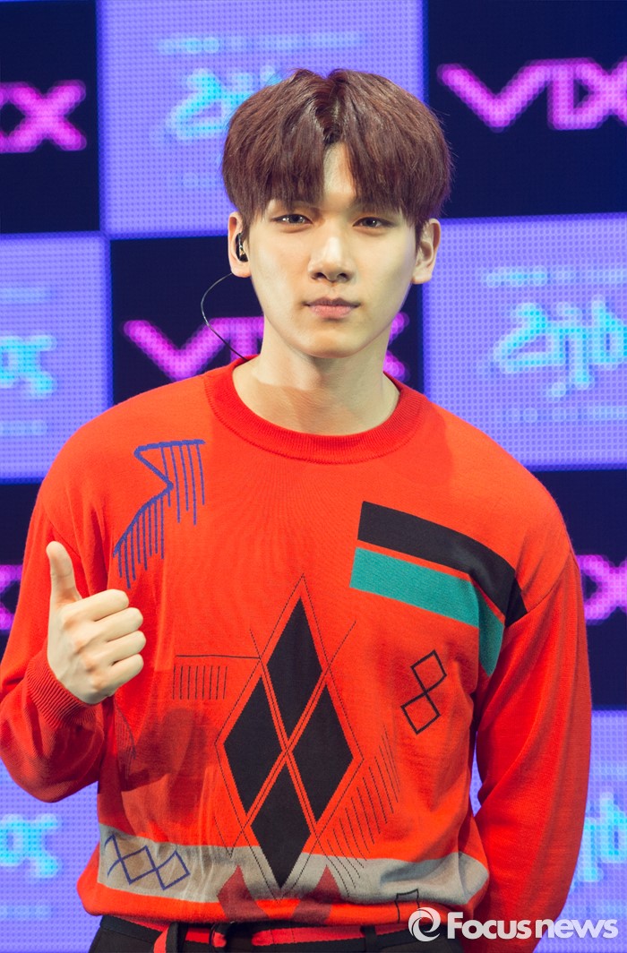 홀서울=포커스뉴스) 19일 오후 서울 마포구 롯데카드 아트센터에서 열린 아이돌그룹 VIXX의 싱글앨범 'Zelos' 발표 쇼케이스에 참여한 멤버 혁이 포토타임을 갖고 있다.