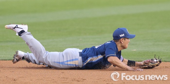 (서울=포커스뉴스) 19일 서울 잠실구장에서 열린 2016 프로야구 NC-LG 경기 1회말 NC 유격수 손시헌이 LG 정주현의 타구를 다이빙하며 잡아내고 있다.