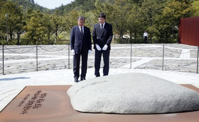 | △ 노무현 전 대통령 묘역 참배하는 문재인-김홍걸 |