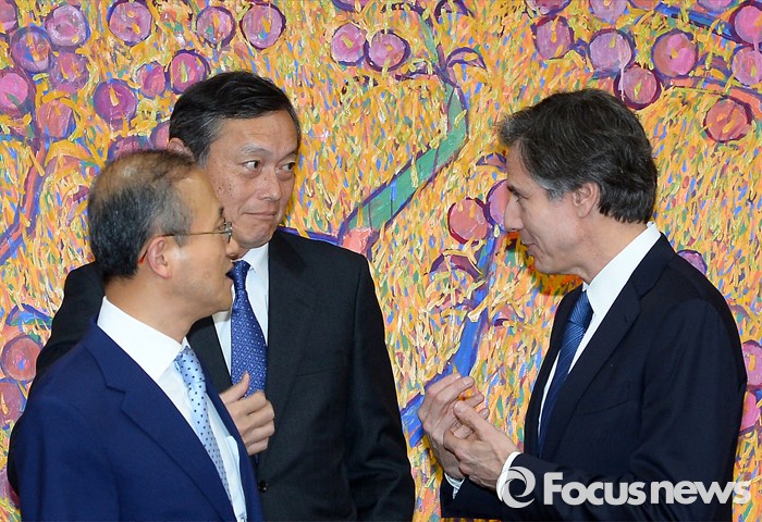 (서울=포커스뉴스) 한미일 외교차관이 19일 오후 서울 종로구 외교부에서 윤병세 외교부 장관과 접견에 앞서 대화를 나누고 있다. 왼쪽부터 사이키 아키타카 일본 외무성 사무차관, 임성남 외교부 제1차관, 토니 블링컨 미국 국무부 부장관.