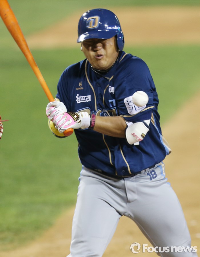 (서울=포커스뉴스) 19일 서울 잠실구장에서 열린 2016 프로야구 NC-LG 경기 4회초 1사 2루에서 NC 박석민이 LG 소사의 투구에 왼쪽 팔꿈치를 맞고 있다.