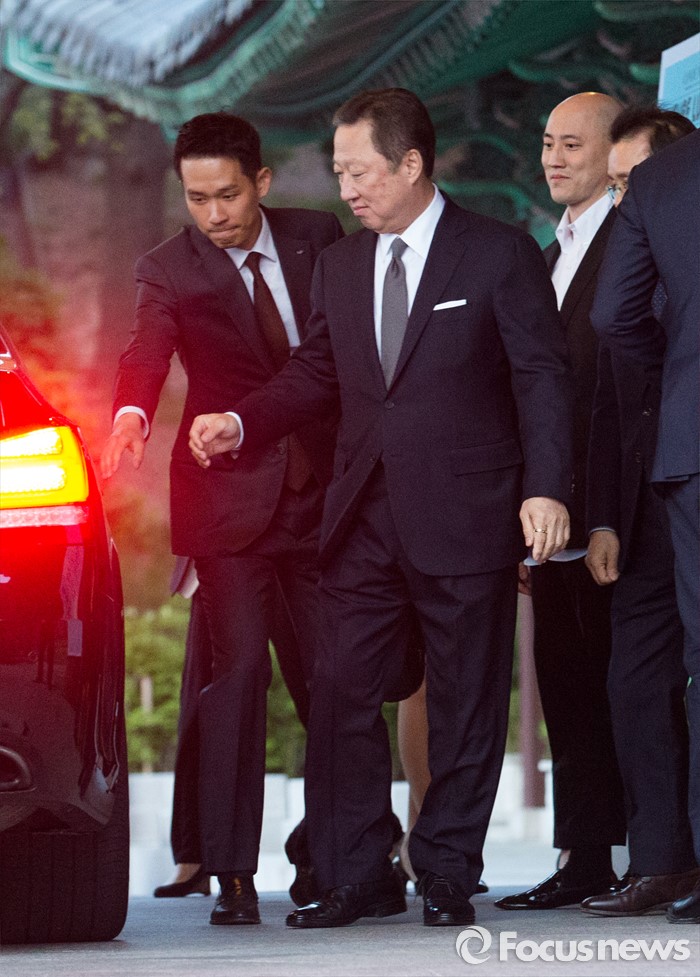 (서울=포커스뉴스) 박용만(왼쪽 두번째) 두산인프라코어 회장이 19일 오후 서울 중구 신라호텔에서 열린 '제2회 컨데나스트 인터내셔널 럭셔리 콘퍼런스' 전야제에 참석 후 행사장을 나서고 있다. 오른쪽 두번째는 박서원 두산면세점 전무.