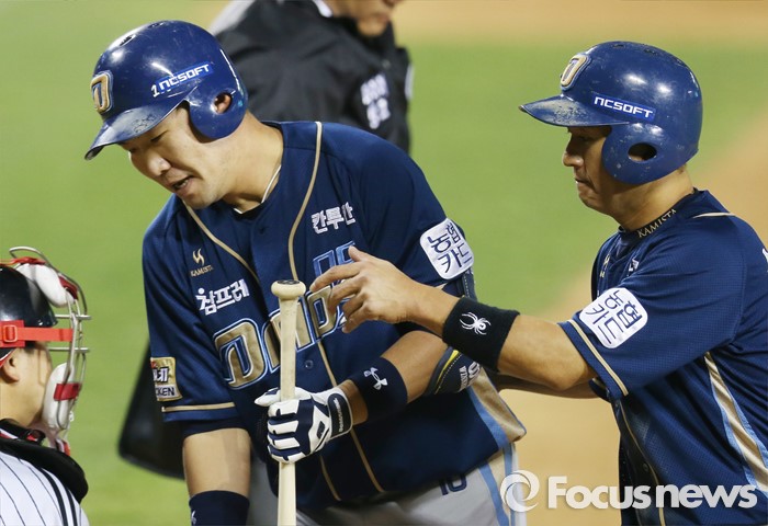 (서울=포커스뉴스) 19일 서울 잠실구장에서 열린 2016 프로야구 NC-LG 경기 6회초 2사 2루에서 NC 지석훈이 좌월 2점 홈런을 치고 홈인하며 선행주자 손시헌의 환영을 받고 있다.