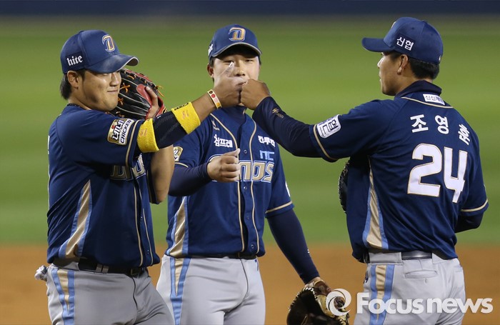 (서울=포커스뉴스) 19일 서울 잠실구장에서 열린 2016 프로야구 NC-LG 경기에서 LG에 승리한 NC 박석민과 조영훈이 주먹을 마주치며 기쁨을 나누고 있다.