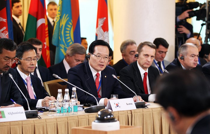 (서울=포커스뉴스) 정의화 국회의장이 19일 오전(현지시각) 러시아 모스크바 래디슨 로얄 호텔에서 열린 1차 유라시아 국회의장 회의에 참석해 21세기 유라시아 국가의 공동 번영을 위한 의회 간 협력을 주제로 개회사를 하고 있다. <사진제공=국회>