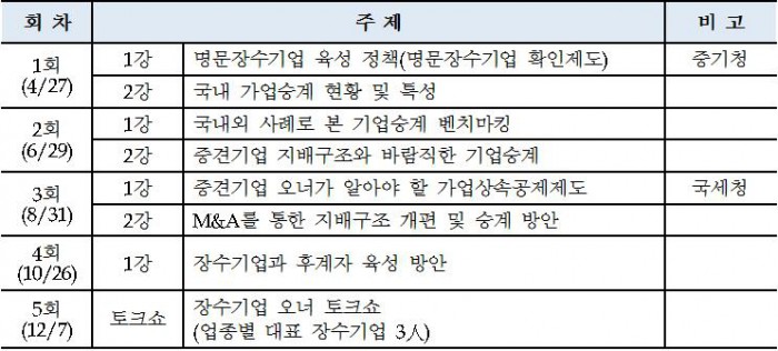오는 27일 개최되는 제1회 포럼에서는 김영신 중기청 중견기업정책국장과 김기찬 가톨릭대학교 교수가 각각 '명문장수기업 육성 정책'과 '국내 가업승계 현황 및 특성'을 주제로 특강을 진행할 예정이다.