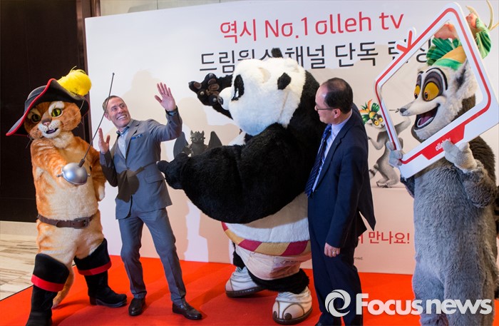 (서울=포커스뉴스) 20일 오전 서울 중구 그랜드 앰버서더 호텔에서 열린 '올레tv 드림웍스 채널 출시' 기자간담회에 참석한 에릭 엘렌보겐(왼쪽) 드림웍스 해외TV사업 대표와 강국현 KT 마케팅본부장이 드림웍스 매니메이션 캐릭터 인형옷을 입은 모델들과 함께 포즈를 취하고 있다.