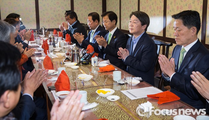 (서울=포커스뉴스) 안철수, 천정배 국민의당 상임공동대표를 비롯한 국민의당 소속 19대 국회의원들이 20일 오후 서울 마포 불교방송국 지하 1층의 한 음식점에서 오찬간담회를 갖고 있다. 오른쪽부터 주승용 원내대표, 안 대표, 천 대표, 박주선 의원