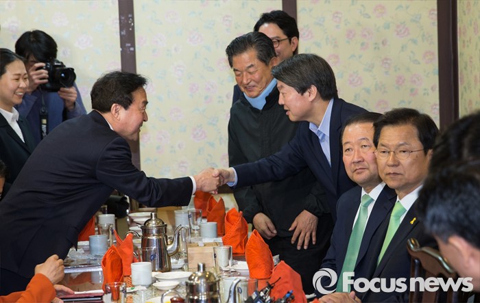 (서울=포커스뉴스) 안철수 국민의당 상임공동대표가 20일 오후 서울 마포 불교방송국 지하 1층의 한 음식점에서 열린 국민의당 소속 제19대 국회의원 오찬 간담회장에 참석해 부좌현 의원에게 감사 트로피를 전달하며 인사하고 있다.