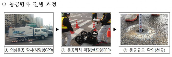 동공탐사용역에서는 차량형 GRP(Ground Penetrating Rader)탐사가 실시됐다. GRP는 전자파를 지표에 투과해 지하의 빈 공간 형상데이터를 수집하는 레이더 장치다.