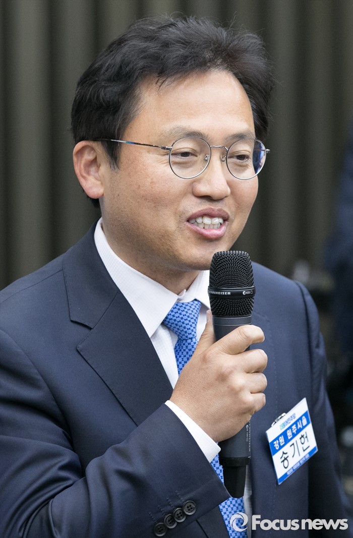 (서울=포커스뉴스) 20일 오전 서울 여의도 국회에서 열린 더불어민주당 20대 총선 당선자 대회에 강원 지역에서 당선한 송기헌 당선인이 인사말을 하고 있다.