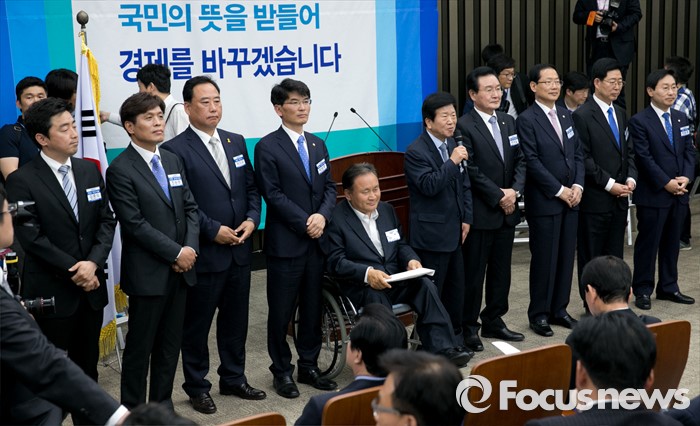 (서울=포커스뉴스) 20일 오전 서울 여의도 국회에서 열린 더불어민주당 20대 총선 당선자 대회에 참석한 대전 및 충청 지역 당선인들이 인사말을 하고 있다. 왼쪽부터 강훈식, 조승래, 어기구, 박완주, 이상민, 박병석, 변재일, 오제세, 양승조, 박범계 당선인.