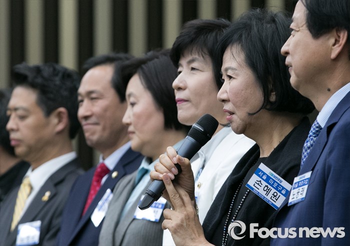 (서울=포커스뉴스) 20일 오전 서울 여의도 국회에서 열린 더불어민주당 20대 총선 당선자 대회에 참석한 손혜원 당선인이 인사말을 하고 있다.
