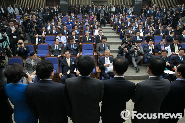 (서울=포커스뉴스) 20일 오전 서울 여의도 국회에서 열린 더불어민주당 20대 총선 당선자 대회에 참석한 김종인 비대위 대표 등 당선인들이 경기도 지역 당선인들의 인사말을 듣고 있다.
