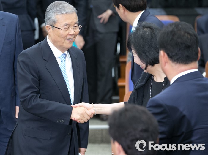 (서울=포커스뉴스) 20일 오전 서울 여의도 국회에서 열린 더불어민주당 20대 총선 당선자 대회에 참석한 김종인(왼쪽) 비대위 대표와 손혜원 당선인이 인사하고 있다.