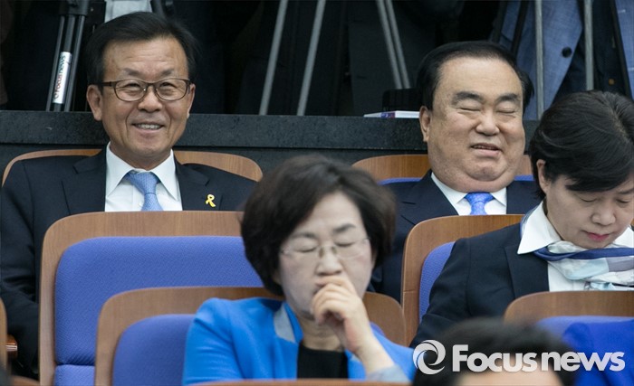 (서울=포커스뉴스) 20일 오전 서울 여의도 국회에서 열린 더불어민주당 20대 총선 당선자 대회에 참석한 원혜영(왼쪽), 문희상 당선인이 자리하고 있다.