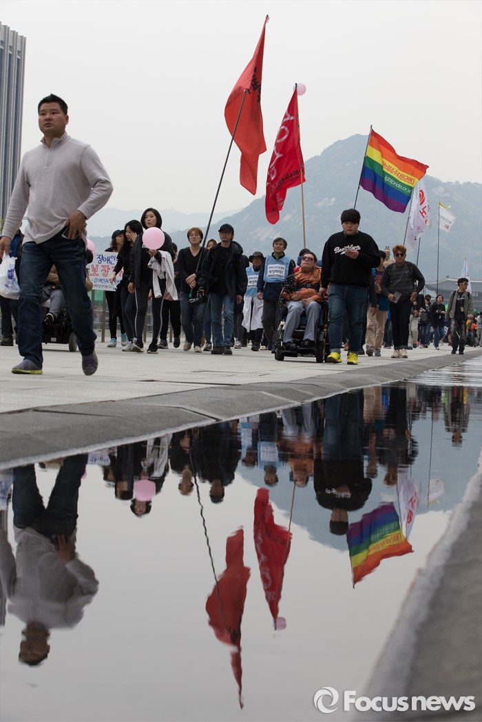 (서울=포커스뉴스) 20일 오후 서울 광화문 광장에서 420장애인차별철폐연대 공동투쟁단 단원들이 '420장애인차별철폐 투쟁결의대회'를 마치고 행진을 하고 있다.