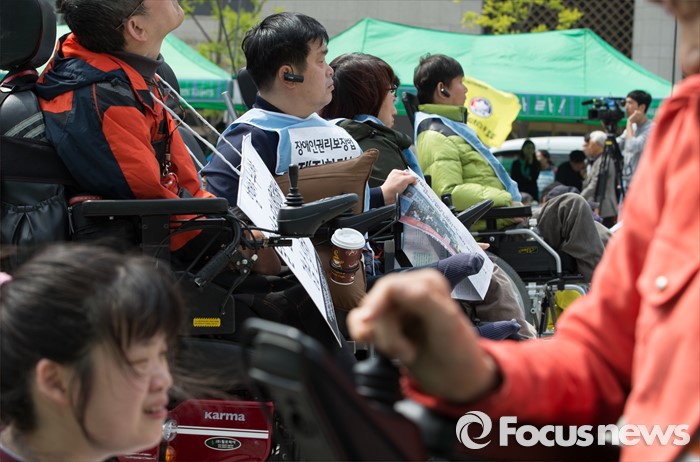 (서울=포커스뉴스) 20일 오후 서울 광화문 광장에서 420장애인차별철폐연대 공동투쟁단 단원들이 '420장애인차별철폐 투쟁결의대회'를 하고 있다.