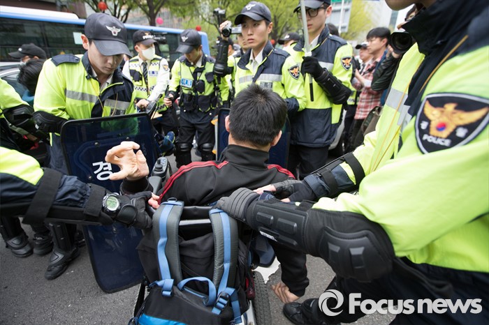 (서울=포커스뉴스) 20일 오후 서울 광화문 광장에서 '420장애인차별철폐 투쟁결의대회'를 마친 일부 참가자들이 행진을 하던중 예정된 진로를 벗어나자 경찰과 대치를 하고 있다.