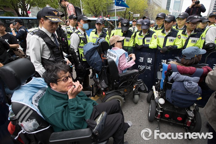 (서울=포커스뉴스) 20일 오후 서울 광화문 광장에서 '420장애인차별철폐 투쟁결의대회'를 마친 일부 참가자들이 행진을 하던중 예정된 진로를 벗어나자 경찰과 대치를 하고 있다.