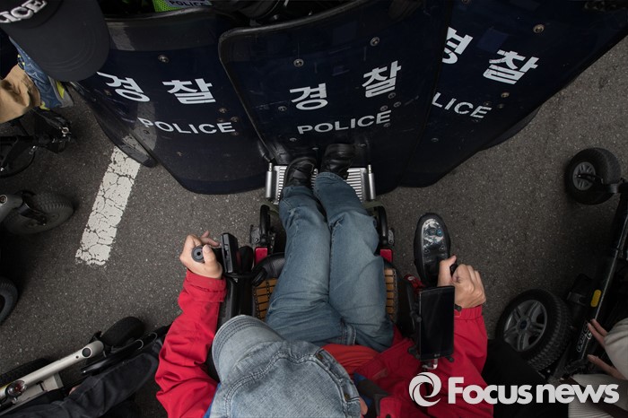 (서울=포커스뉴스) 20일 오후 서울 광화문 광장에서 '420장애인차별철폐 투쟁결의대회'를 마친 일부 참가자들이 행진을 하던중 예정된 진로를 벗어나자 경찰과 대치를 하고 있다.