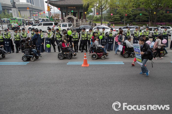 (서울=포커스뉴스) 20일 오후 서울 광화문 광장에서 420장애인차별철폐연대 공동투쟁단 단원들이 '420장애인차별철폐 투쟁결의대회'를 마치고 행진을 하고 있다.