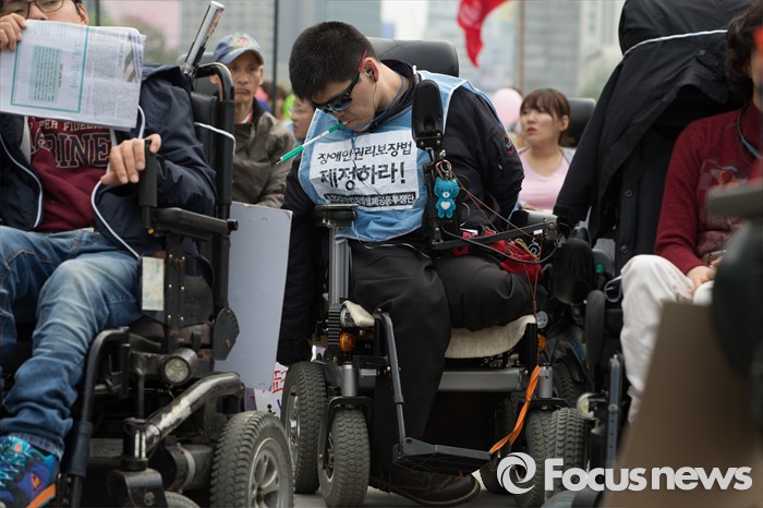 (서울=포커스뉴스) 20일 오후 서울 광화문 광장에서 420장애인차별철폐연대 공동투쟁단 단원들이 '420장애인차별철폐 투쟁결의대회'를 하고 있다.