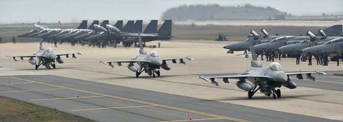 (서울=포커스뉴스) 지난 15일부터 오는 29일까지 전북 군산 비행장에서 실시되고 있는 한·미 공군 대규모 항공전역훈련인 맥스썬더 훈련에 참가한 美 공군 F-16 전투기가 이륙 전 활주하고 있다. <사진제공=공군>