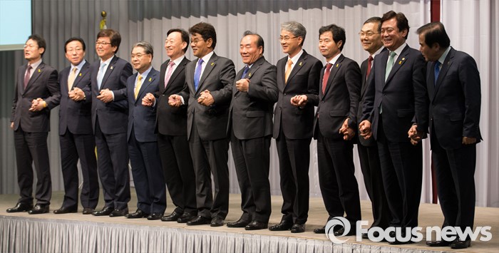 (인천=포커스뉴스) 전국 교육감들이 20일 오후 인천 중구 하버파크호텔에서 열린 전국 시도교육감협의회 간담회에 참석해 기념촬영 중 손을 잡고 있다. 왼쪽부터 조희연 서울시교육감, 민병희 강원도교육감, 최교진 세종시교육감, 이재정 경기도교육감, 설동호 대전시교육감, 이청연 인천시교육감, 장휘국 광주시교육감, 박종훈 경남도교육감, 김승환 전북도교육감, 장만채 전남도교육감, 김병우 충북도교육감, 김지철 충남도교육감.