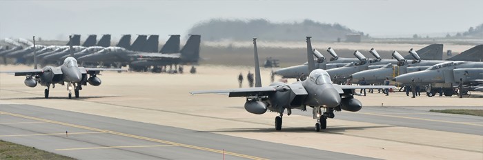 (서울=포커스뉴스) 지난 15일부터 오는 29일까지 전북 군산 비행장에서 실시되고 있는 한·미 공군 대규모 항공전역훈련인 맥스썬더 훈련에 참가한 한국 공군 F-15K 전투기가 이륙 전 활주하고 있다. <사진제공=공군>