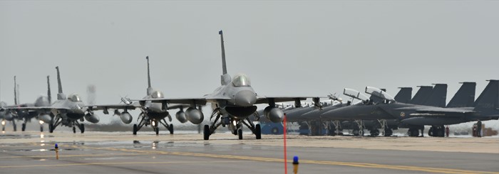 (서울=포커스뉴스) 지난 15일부터 오는 29일까지 전북 군산 비행장에서 실시되고 있는 한·미 공군 대규모 항공전역훈련인 맥스썬더 훈련에 참가한 美 공군 F-16 전투기가 이륙 전 활주하고 있다. <사진제공=공군>