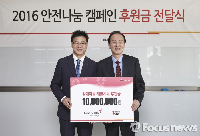 한편 금호타이어는 지난 2013년부터 SRC와 '안전나눔 캠페인' 후원 협약을 맺고 지속적인 캠페인 활동에 나서고 있다.금호타이어의 ‘안전나눔 캠페인’을 위해 19일 '공감, 행복한 세상' 후원금 전달식에 참석한 조남화 금호타이어 SCM담당 상무(왼쪽)와 이봉희 SRC 후원사업단장의 모습. <사진제공=금호타이어>