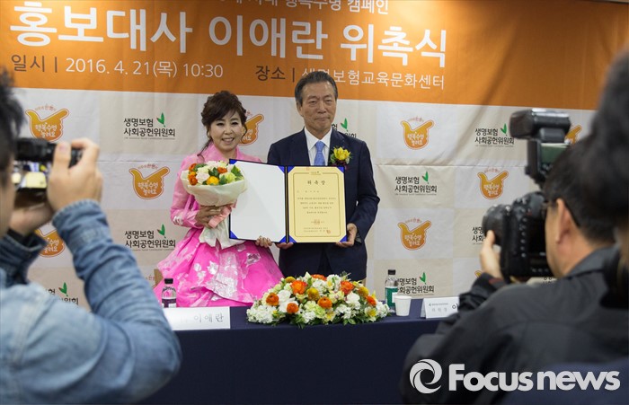 (서울=포커스뉴스) 21일 오전 서울 종로구 센터포인트빌딩에서 열린 '생명보험사회공헌위원회 '100세 시대 행복수명 캠페인' 홍보대사 위촉식에 참석한 가수 이애란(왼쪽)과 이수창 공동위원장이 기념사진을 찍고 있다.
