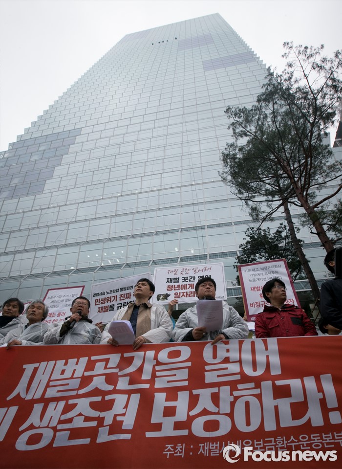 (서울=포커스뉴스) 21일 오전 서울 여의도 전경련회관 앞에서 재벌사내유보금환수운동본부 등 관련단체 회원들이 재벌사내유보금 현황발표 및 환수운동 선포 기자회견을 하고 있다