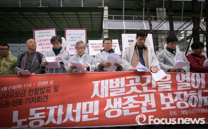 (서울=포커스뉴스) 21일 오전 서울 여의도 전경련회관 앞에서 재벌사내유보금환수운동본부 등 관련단체 회원들이 재벌사내유보금 현황발표 및 환수운동 선포 기자회견을 하고 있다