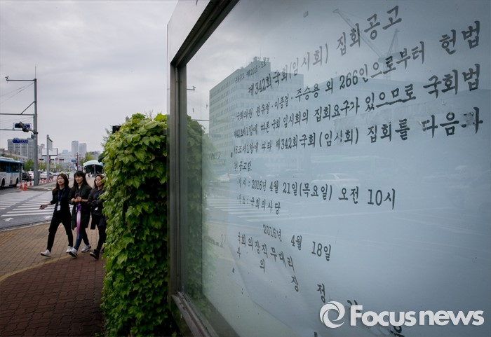 (서울=포커스뉴스) 21일 오후 서울 여의도 국회 앞 게시판에 19대 마지막 임시국회를 알리는 공고가 게시되어 있다.