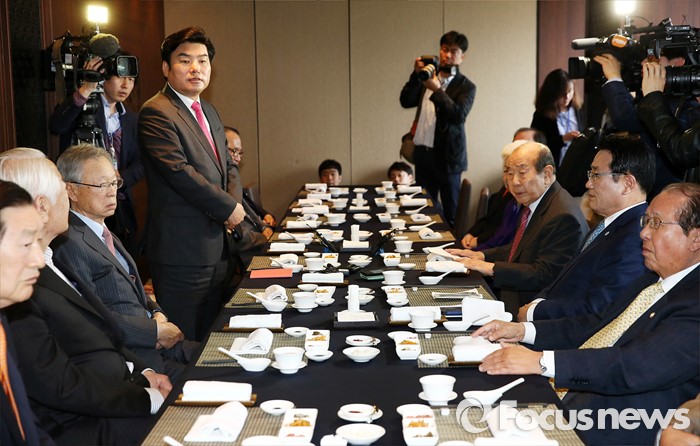 (서울=포커스뉴스) 원유철(왼쪽 네번째) 새누리당 원내대표가 21일 오후 서울 여의도 LG트윈타워의 한 중식당에서 상임고문단 오찬회에 참석해, 인사말을 하고 있다.