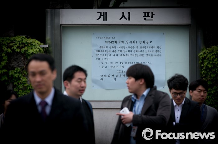 (서울=포커스뉴스) 21일 오후 서울 여의도 국회 앞 게시판에 19대 마지막 임시국회를 알리는 공고가 게시되어 있다.