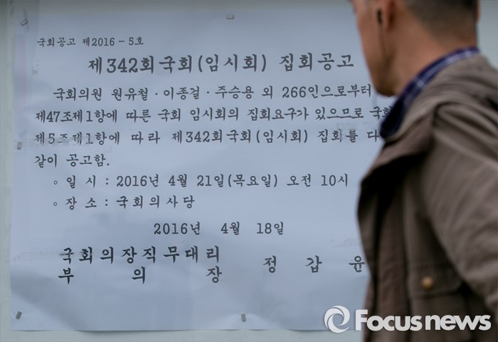 (서울=포커스뉴스) 21일 오후 서울 여의도 국회 앞 게시판에 19대 마지막 임시국회를 알리는 공고가 게시되어 있다.