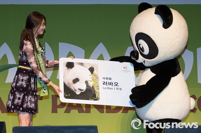 (용인=포커스뉴스) 21일 오전 경기도 용인시 에버랜드에서 열린 '판다월드 개관식'에서 미쓰에이 수지가 러바오 팬더 캐릭터 인형에게 명예 사원증을 전달하고 있다.