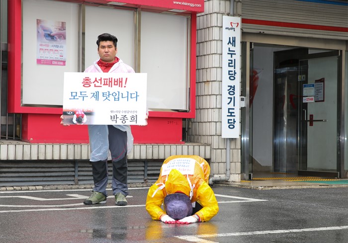 (서울=포커스뉴스) 20대 총선에서 경기 수원갑에 출마했다가 낙선한 박종희 새누리당 제2사무부총장이 21일 오전 경기도 수원 경기도당 사무실에서 사죄의 삼보일배를 하고 있다. <사진제공=박종희 전 의원>