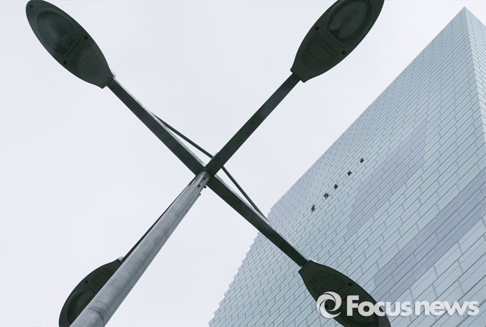 (서울=포커스뉴스) 비가 내린 21일 오전 서울 여의도 전경련회관에서 청소업체 관계자들이 회관 외벽 청소를 하고 있다.