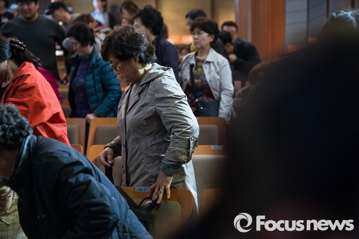 (서울=포커스뉴스) 21일 오후 서울 중구 명동예술극장에서 열린 '대테러훈련'에 참석한 일반 관객들이 대피훈련을 하고 있다.